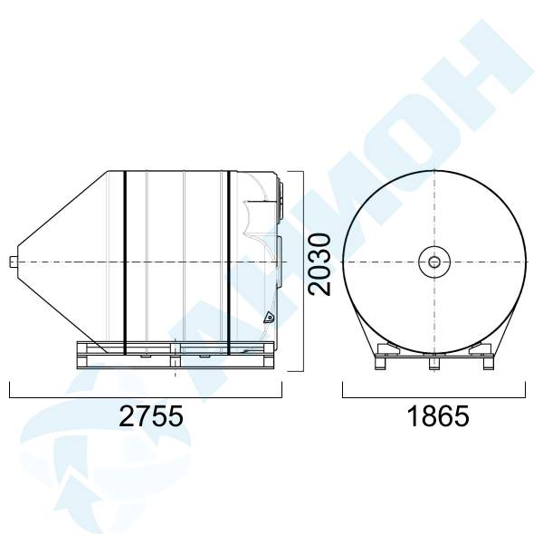 Полиэтиленовая емкость в горизонтальном положении уложена и закреплена лентой на транспортировочном поддоне.