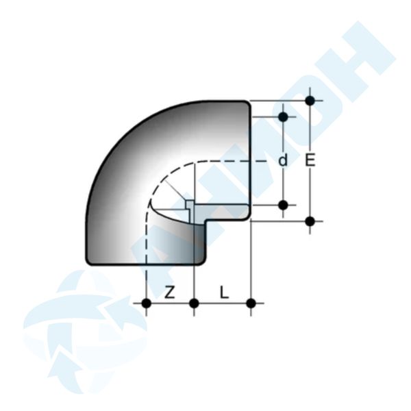 Отвод 90 град. для холодной сварки (клеевое соединение). Входит в группу фитингов, предназначенных для транспортировки жидкостей под давлением, соединяемых методом холодной сварки.
