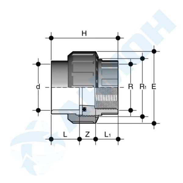 Муфта разборная переходная с внутренней резьбой. Входит в группу фитингов, предназначенных для транспортировки жидкостей под давлением, соединяемых методом холодной сварки.