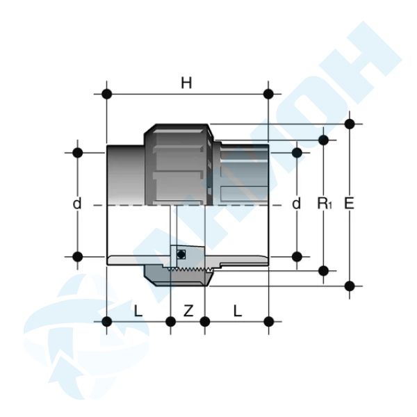 Муфта разборная переходная. Входит в группу фитингов, предназначенных для транспортировки жидкостей под давлением, соединяемых методом холодной сварки.