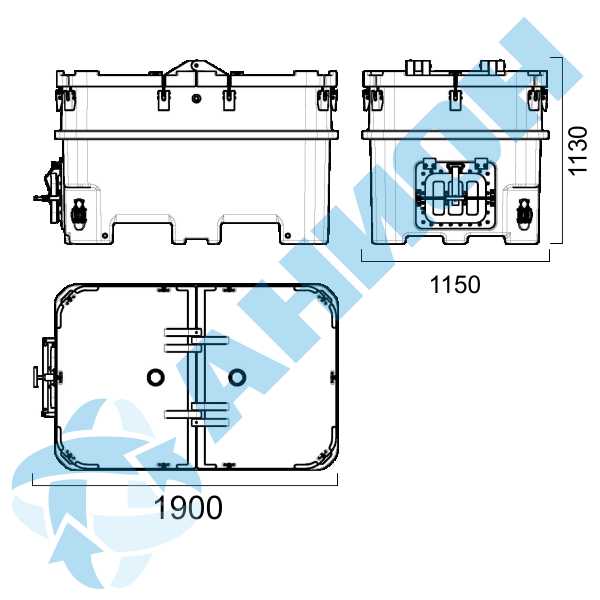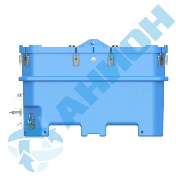 Между крышками и контейнером проложен резиновый жгут, предотвращающий выплескивание жидкости. По углам ванны контейнера имеются четыре ручки. Их можно использовать при погрузочно-разгрузочных работах на пустых контейнерах и для фиксации контейнера при перевозке.