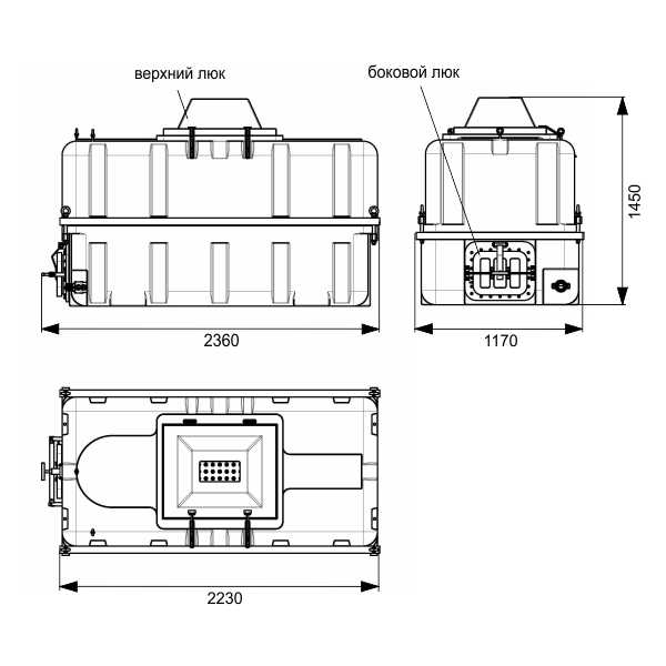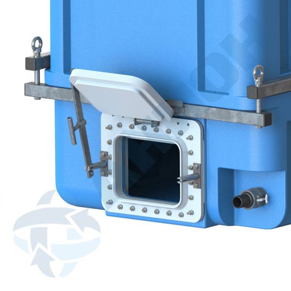 Сверху на контейнере установлен откидной люк 60х70 см, который дает возможность перегружать рыбу используя сачок или рыбоподъемник. Через отверстия в люке происходит вентиляция внутренней полости, но в тоже время его конструкция препятствует выплескиванию воды при перевозках и перемещениях. Люк легко откидывается на петлях, а крепится простым натягиванием резиновых петель-раберов.