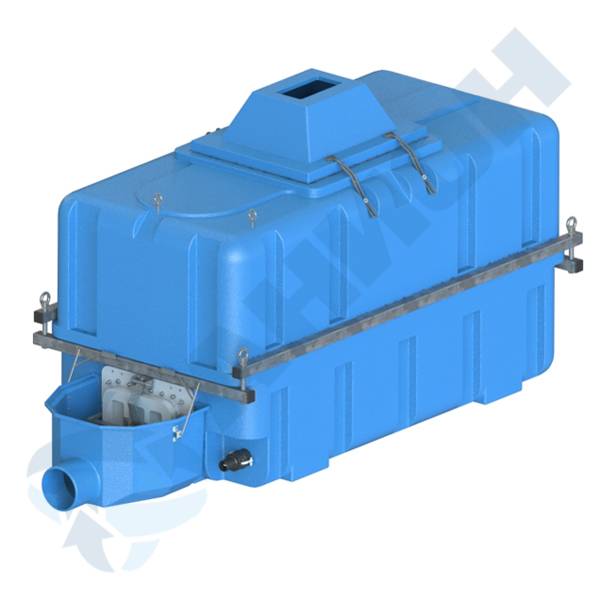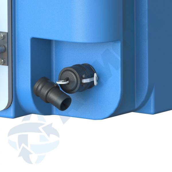В нижнем углу торцевой поверхности контейнера размещена заслонка 2” с защитным (от попадания в слив мелкой рыбы) грибком и штуцером для подключения сливного шланга. Рукоятка ручного открытия / закрытия выведена на верхнюю поверхность контейнера для удобства использования.