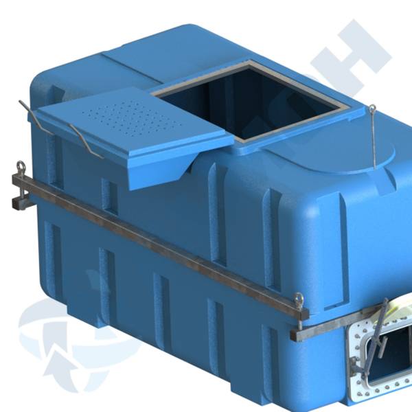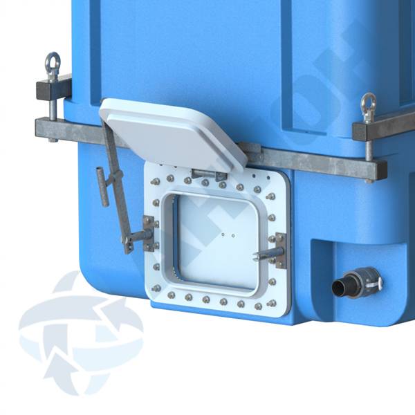 Сверху на контейнере установлен откидной люк 60х70 см, который дает возможность перегружать рыбу используя сачок или рыбоподъемник. Через отверстия в люке происходит вентиляция внутренней полости, но в тоже время его конструкция препятствует выплескиванию воды при перевозках и перемещениях. Люк легко откидывается на петлях, а крепится простым натягиванием резиновых петель-раберов.