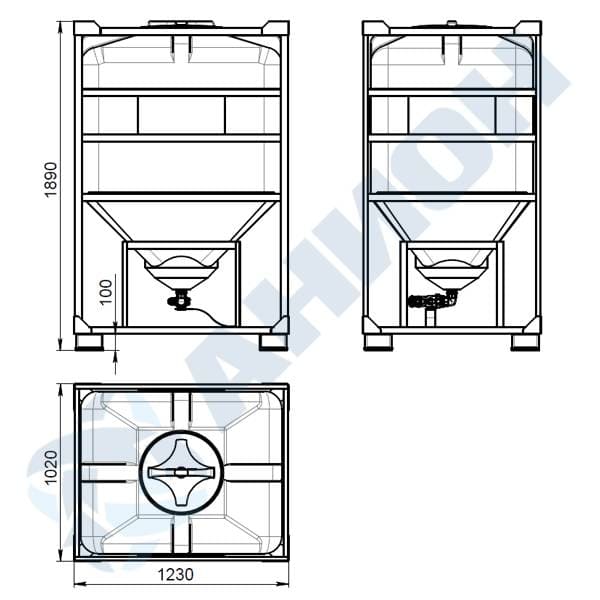 Контейнер 1100 л с резьбовой горловиной и крышкой с клапанами и со сливом 1 1/4" Viton