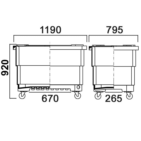 Пластиковый контейнер представляет собой бесшовный резервуар из светостабилизированного полиэтилена на четырех колесах. В нижней части он оснащен двумя сливными штуцерами с заглушками. Дополнительно может комплектоваться съемной крышкой К500.